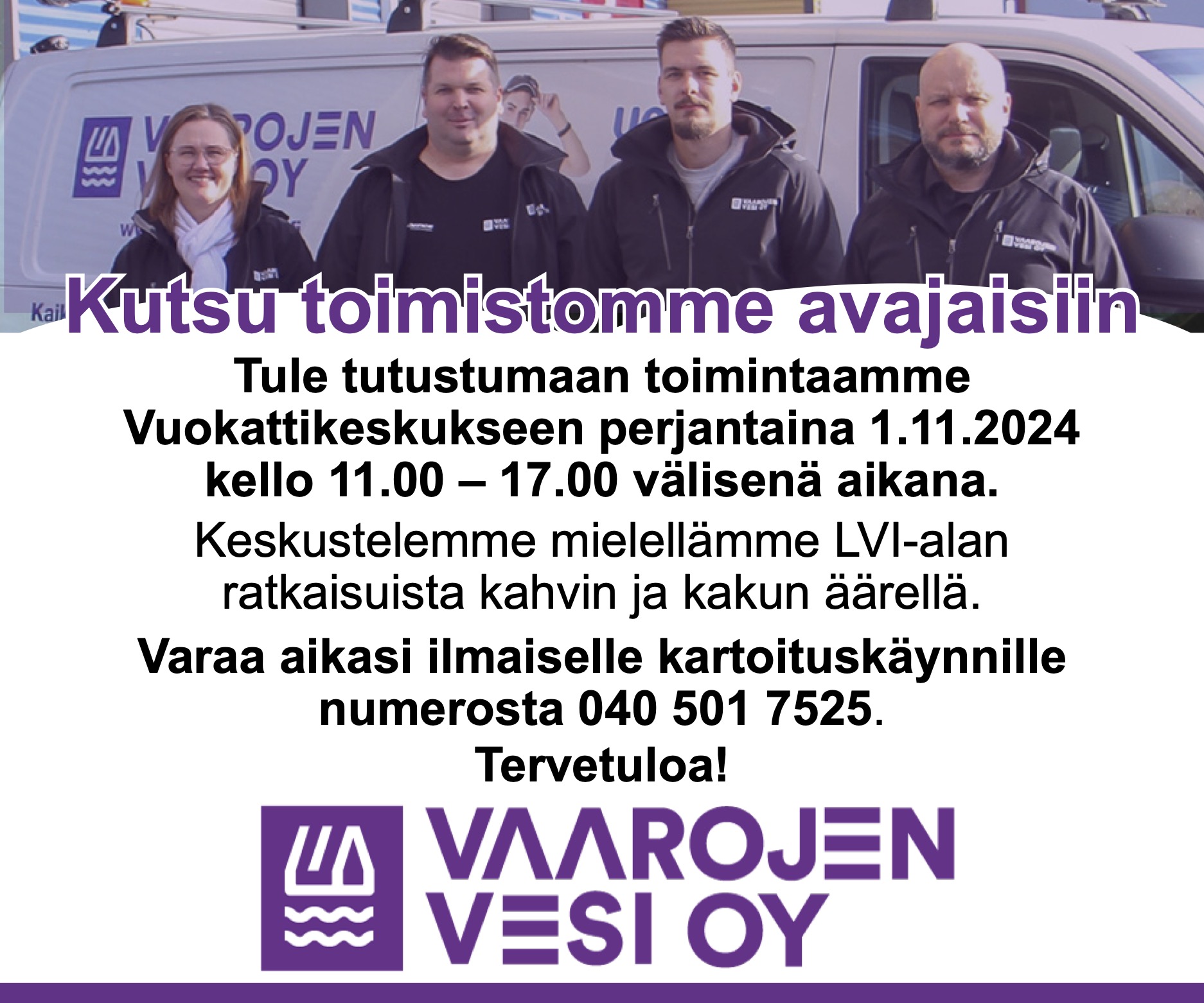 Tule tutustumaan toimintaamme Vuokattikeskukseen osoitteeseen Vuokatinhovintie 2 liiketila 10, 88610 Vuokatti perjantaina 1.11.2024 kello 11.00 – 17.00 välisenä aikana. Keskustelemme mielellämme LVI-alan ratkaisuista kahvin ja kakun äärellä. Samalla tarjoamme lämmityskauden huipputarjouksia. Kakkua riittää 100:lle ensimmäiselle 🙂